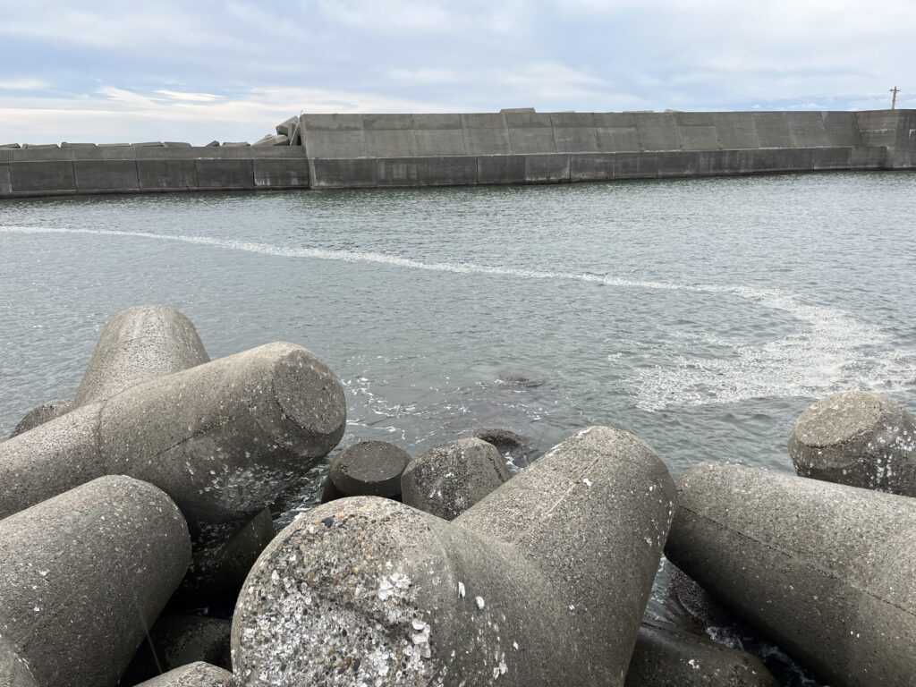 堤防周りでは波の飛沫と潮が混ざり合い、キレイな潮目が形成✨